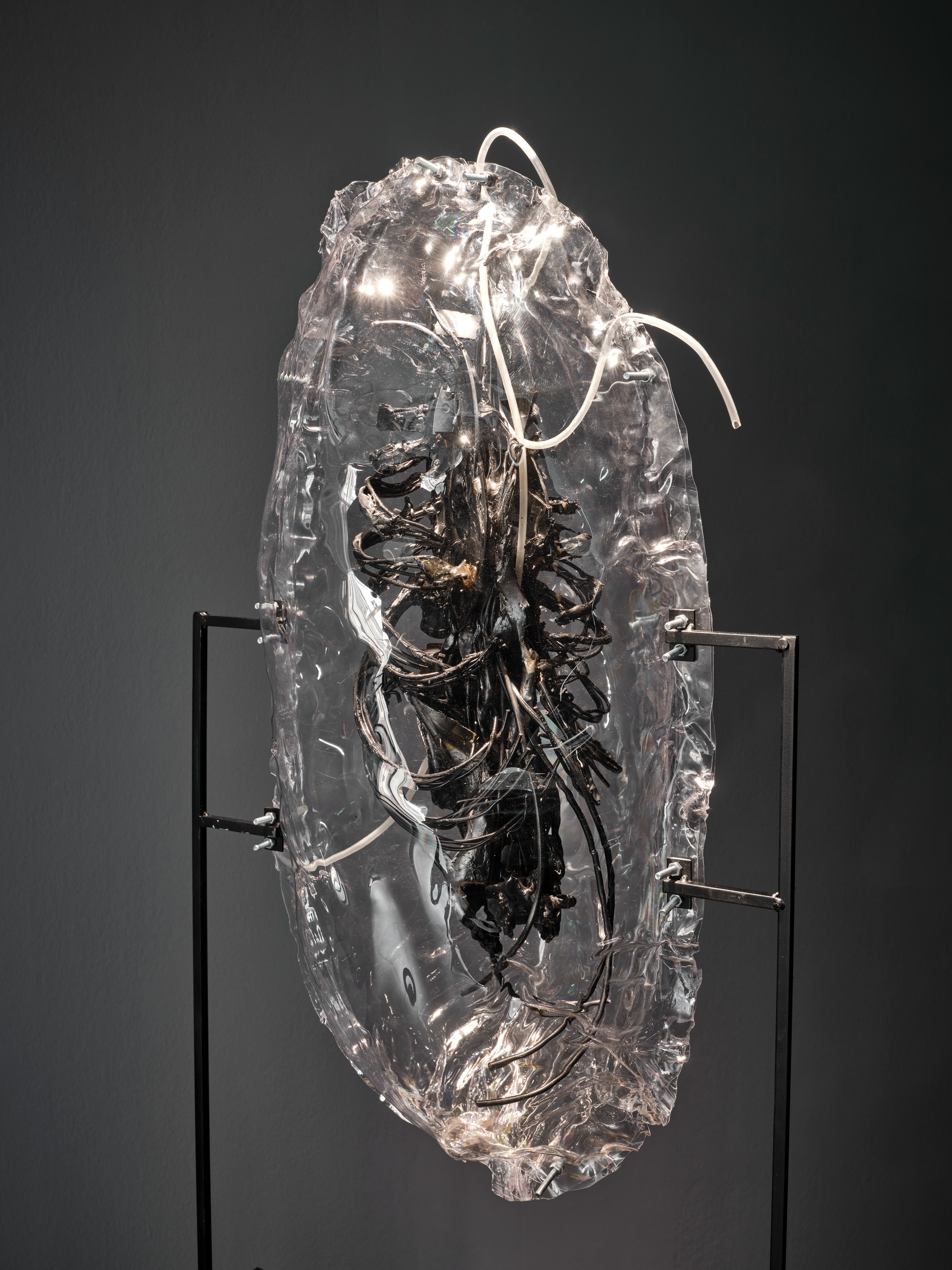 Yein Lee, System of In-between State 3, 2024, Steel, polymer gypsum, epoxy putty, natural elements, silicone, found object, fiberglass, acrylic ink, lacquer, 174 × 84 × 88 cm, Courtesy of the artist. Sponsored by Austria Ministry of the Arts, Culture, the Civil service and Sport. Commissioned by the 15th Gwangju Biennale. Photo by Heoyu, Courtesy of the artist
