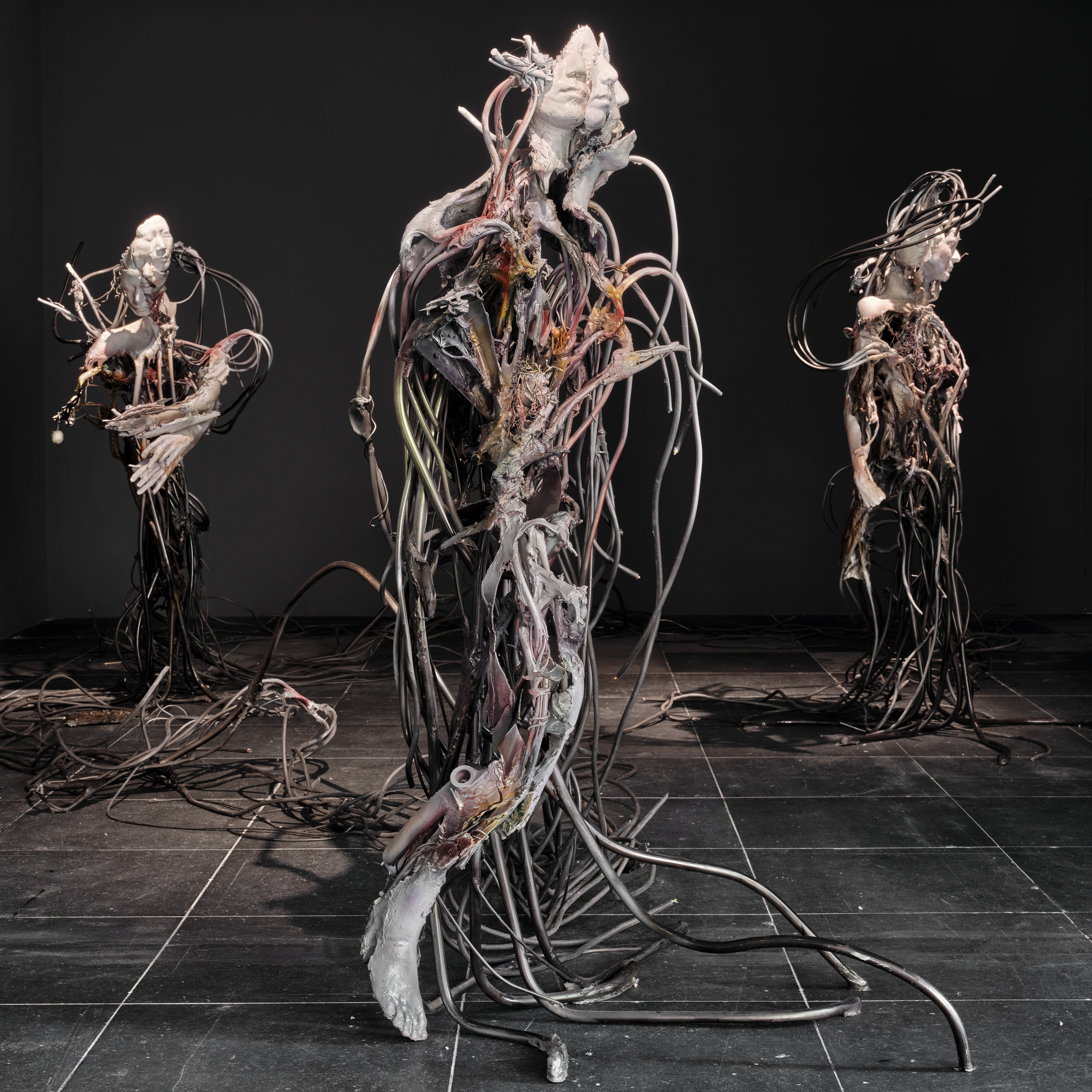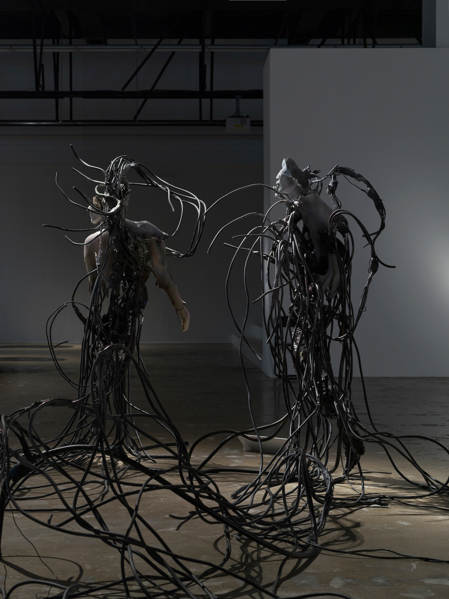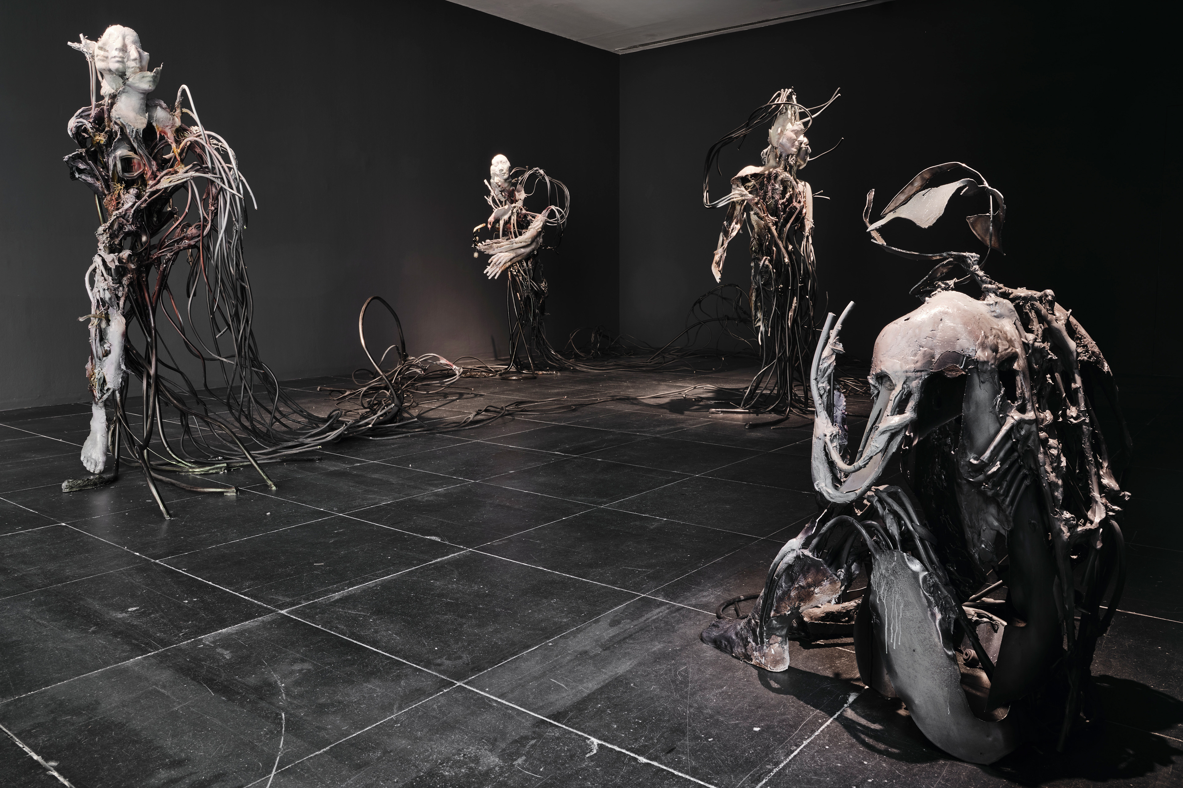 Installation View of 15th Gwangju Biennale 2024, System of In-between State 1, 2024, Steel, polymer gypsum, epoxy putty, branches, dry grape stalk, broken vacuum cleaner, electrical cables, fiberglass, acrylic ink, lacquer, 186 × 125 × 110cm(floor elements approx 300 cm), Commissioned by the 15th Gwangju Biennale. Sponsored by Austria Ministry of the Arts, Culture, the Civil service and Sport. Photo by Heoyu